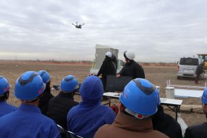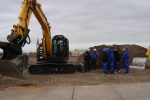 ドローンの飛行実演、3D測量機器の説明、ショベルのバケットが全方向に動作する重機の実演、